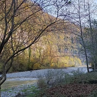 - Ущелье Ахштырское. Типичная для Сочи природа с белыми скалами и бурной горной речкой. Над нами самый протяжённый пешеходный мост в мире Скайбридж, а вокруг реликтовый лес с самшитами и тисами.